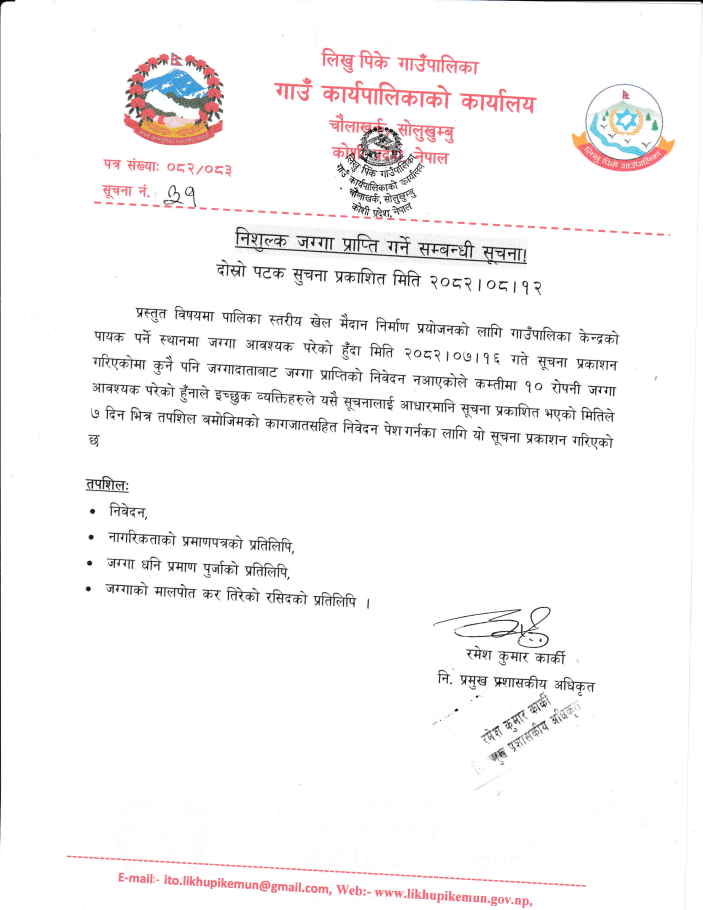 पालिका स्तरीय खेल मैदान निर्माणका लागि नि:शुल्क जग्गा प्राप्ति गर्ने सम्बन्धी सार्वजनिक सूचना!