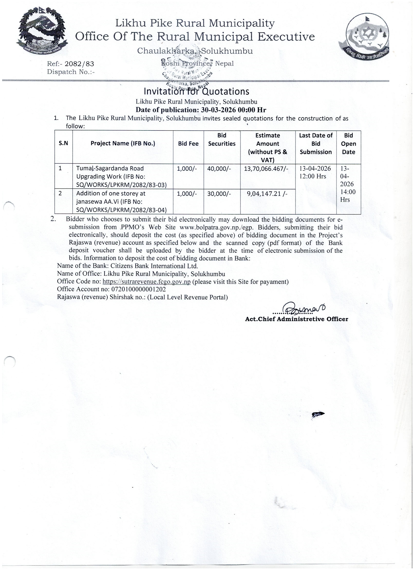 सार्वजनिक खरिद/बोलपत्र सम्बन्धी सूचना