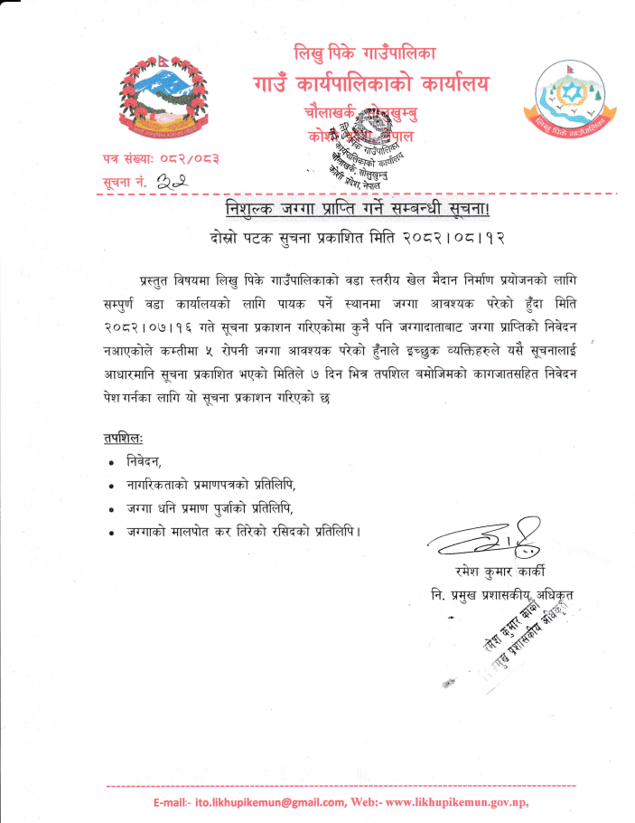 वडा स्तरीय खेल मैदान निर्माणका लागि नि:शुल्क जग्गा प्राप्ति गर्ने सम्बन्धी सार्वजनिक सूचना!