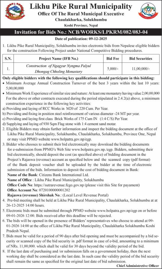 Invitation for Bids for the Construction of Ngagyur Nyngma Palyul Dhongag Chholing Monastery.